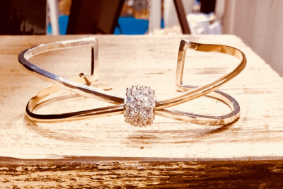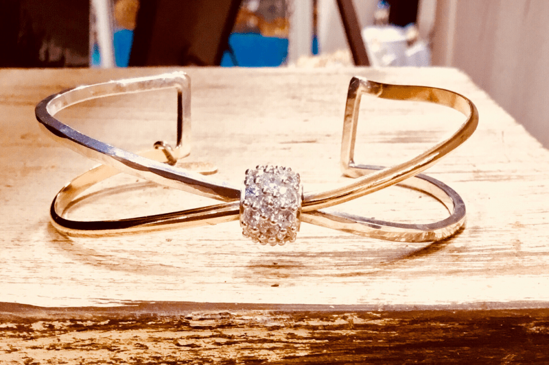 • Our new Coco Bracelet is an elegant new design! It features a heavy hammered Sterling and Gold Filled crossover design with a 360 degrees of bling in the center featuring high quality CZ’s.